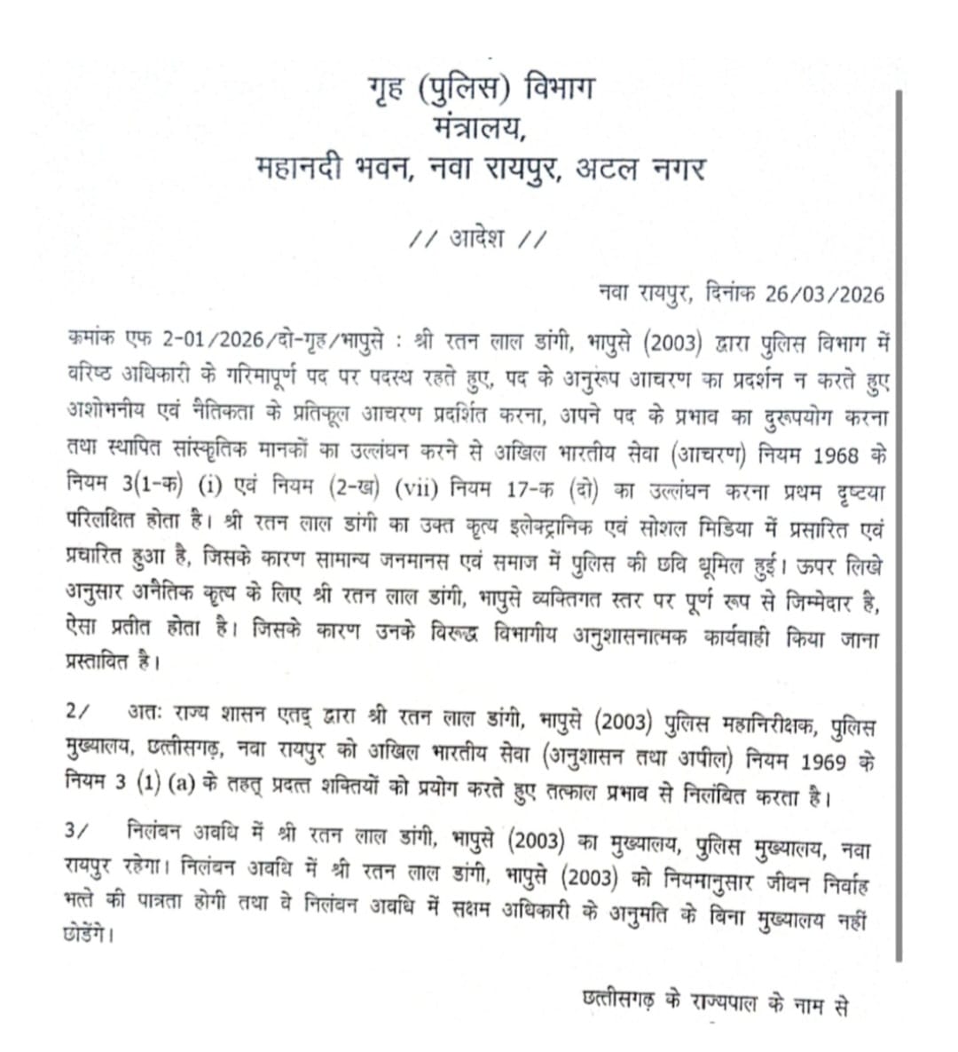 रायपुर । IPS रतनलाल डांगी को राज्य सरकार ने सस्पेंड कर दिया है। महिला के साथ कथित अश्लील चैट वायरल होने के मामले में राज्य सरकार ने ये कार्रवाई की है।आदेश में कहा गया है कि अधिकारी ने अपने पद के अनुरूप आचरण नहीं किया और गरिमापूर्ण पद पर रहते हुए नैतिकता के प्रतिकूल व्यवहार किया।
