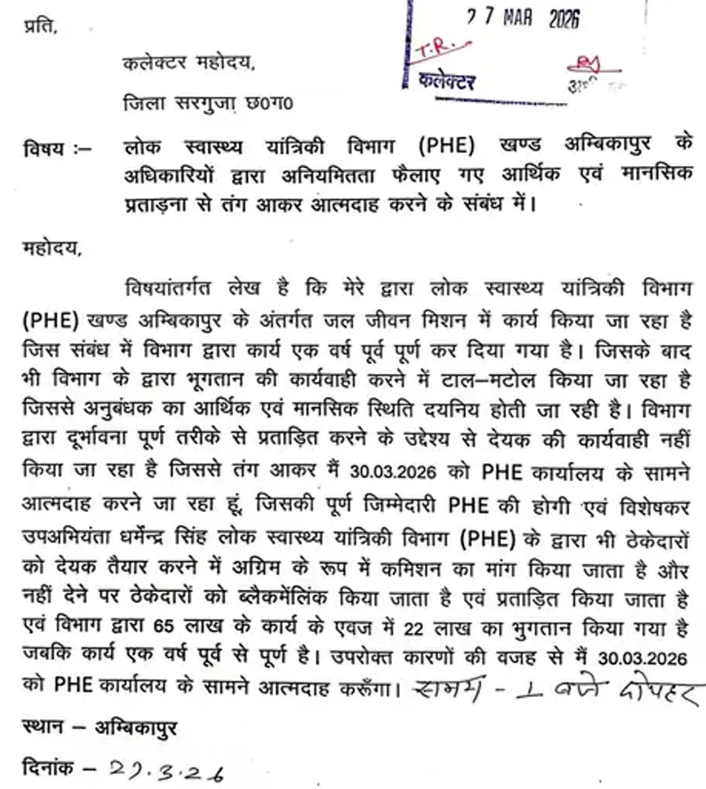 ठेकेदार ने अपने लिखित पत्र में आरोप लगाया है कि विभागीय अधिकारी बिल पास करने के एवज में ‘अग्रिम कमीशन’ की मांग कर रहे हैं। मांग पूरी न करने पर फाइल रोक दी गई और लगातार मानसिक प्रताड़ना दी जा रही है।