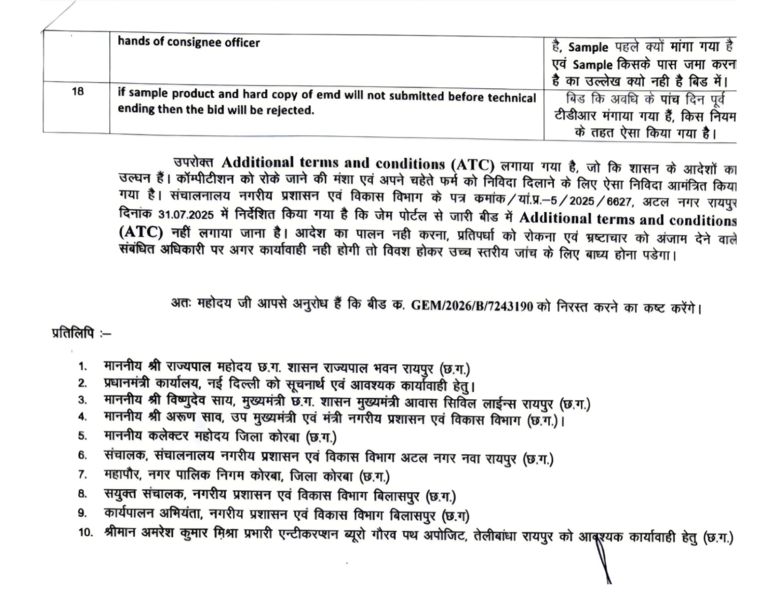 उपरोक्त Additional terms and conditions (ATC) लगाया गया है, जो कि शासन के आदेशों का उल्घन हैं। कॉम्पीटीशन को रोके जाने की मंशा एवं अपने चहेते फर्म को निविदा दिलाने के लिए ऐसा निविदा आमंत्रित किया गया है। संचालनालय नगरीय प्रशासन एवं विकास विभाग के पत्र कमांक/ यां.प्र.-5/2025/6627, अटल नगर रायपुर दिनांक 31.07.2025 में निर्देशित किया गया है कि जेम पोर्टल से जारी बीड में Additional terms and conditions (ATC) नहीं लगाया जाना है। आदेश का पालन नहीं करना, प्रतिपर्धा को रोकना एवं भ्रष्टाचार को अंजाम देने वाले संबंधित अधिकारी पर अगर कार्यावाही नहीं होगी तो विवश होकर उच्च स्तरीय जांच के लिए बाध्य होना पडेगा।
