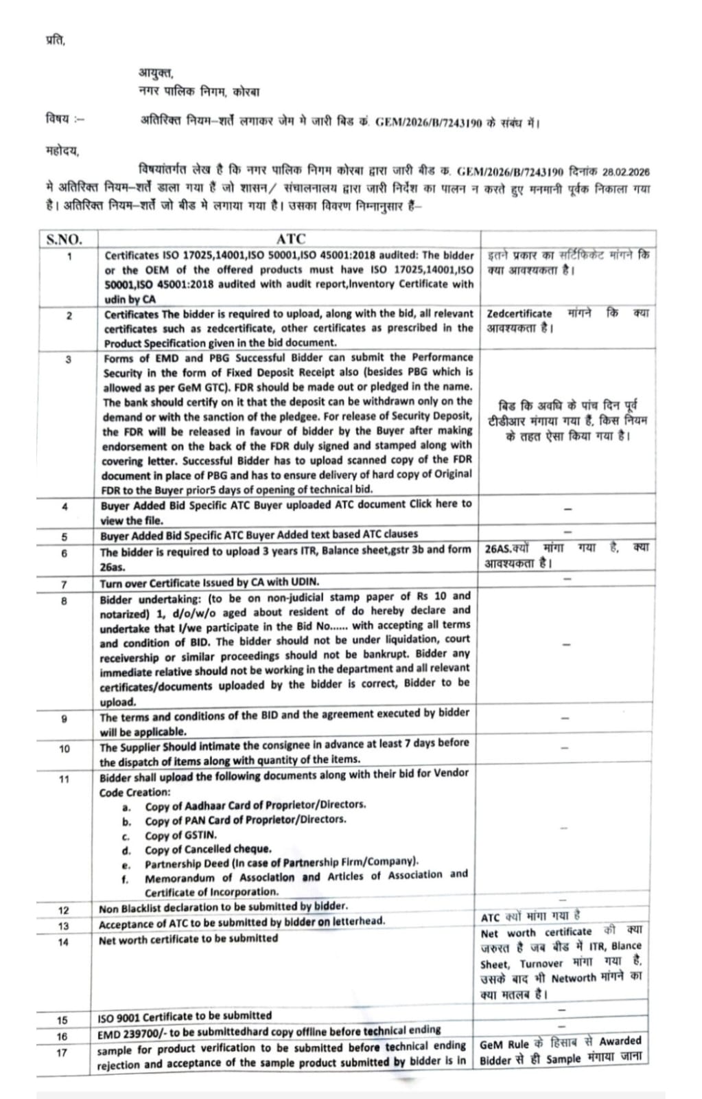 आयुक्त को अवगत कराया गया है कि नगर पालिक निगम कोरबा द्वारा जारी बीड क. GEM/2026/B/7243190 दिनांक 28.02.2026 मे अतिरिक्त नियम-शर्तें डाला गया है जो शासन / संचालनालय द्वारा जारी निर्देश का पालन न करते हुए मनमानी पूर्वक निकाला गया है। अतिरिक्त नियम-शर्तें जो बीड में लगाया गया है। उसका विवरण निम्नानुसार है:-