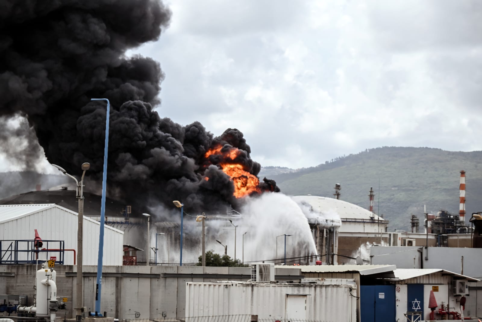 इजराइल के हाइफा शहर में सोमवार को हिजबुल्लाह की तरफ से दागी गई एक ईरानी मिसाइल अटैक के बाद ऑयल रिफाइनरी में आग लग गई।