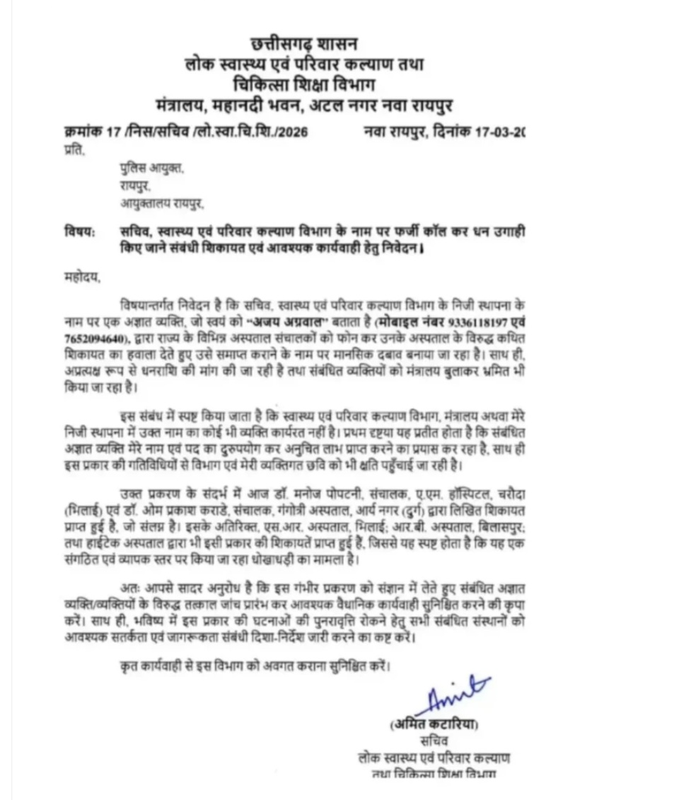 मामला बढ़ने पर सचिव ने पुलिस में शिकायत दर्ज कराने की पहल की है। जानकारी के अनुसार आरोपी खुद को ‘अजय अग्रवाल’ बताकर अस्पताल संचालकों को फोन करता था और कहता था कि उनके अस्पताल के खिलाफ मंत्रालय में शिकायत आई है। इसके बाद वह कार्रवाई से बचाने या शिकायत दबाने के नाम पर मोटी रकम की मांग करता था।