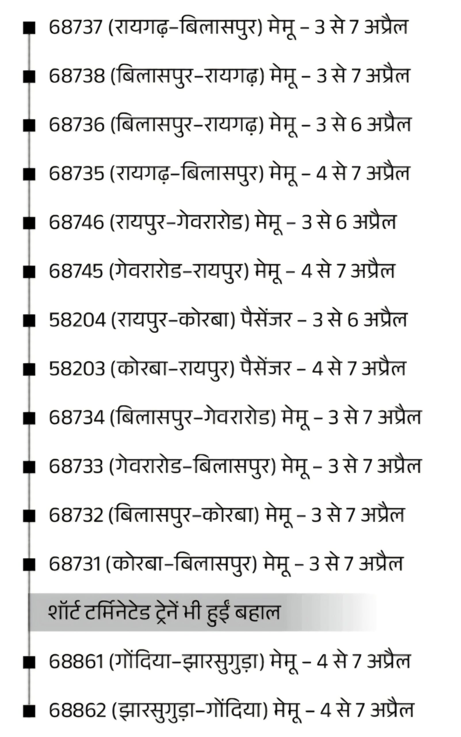 इससे पहले नागपुर मंडल से होकर गुजरने वाली चार एक्सप्रेस ट्रेनों को भी दोबारा शुरू किया गया था। गोंदिया स्टेशन के प्लेटफार्म नंबर 3, लाइन नंबर 5 पर वॉशेबल एप्रन को हटाकर उसे बैलस्टेड ट्रैक में बदलने के कार्य के कारण इन गाड़ियों को अस्थायी रूप से रद्द किया गया था।रेलवे ने यात्रियों से अपील की है कि यात्रा से पहले ट्रेन की सही स्थिति की जानकारी अधिकृत पूछताछ सेवा NTES/139 से जरूर लें, ताकि किसी प्रकार की असुविधा से बचा जा सके।