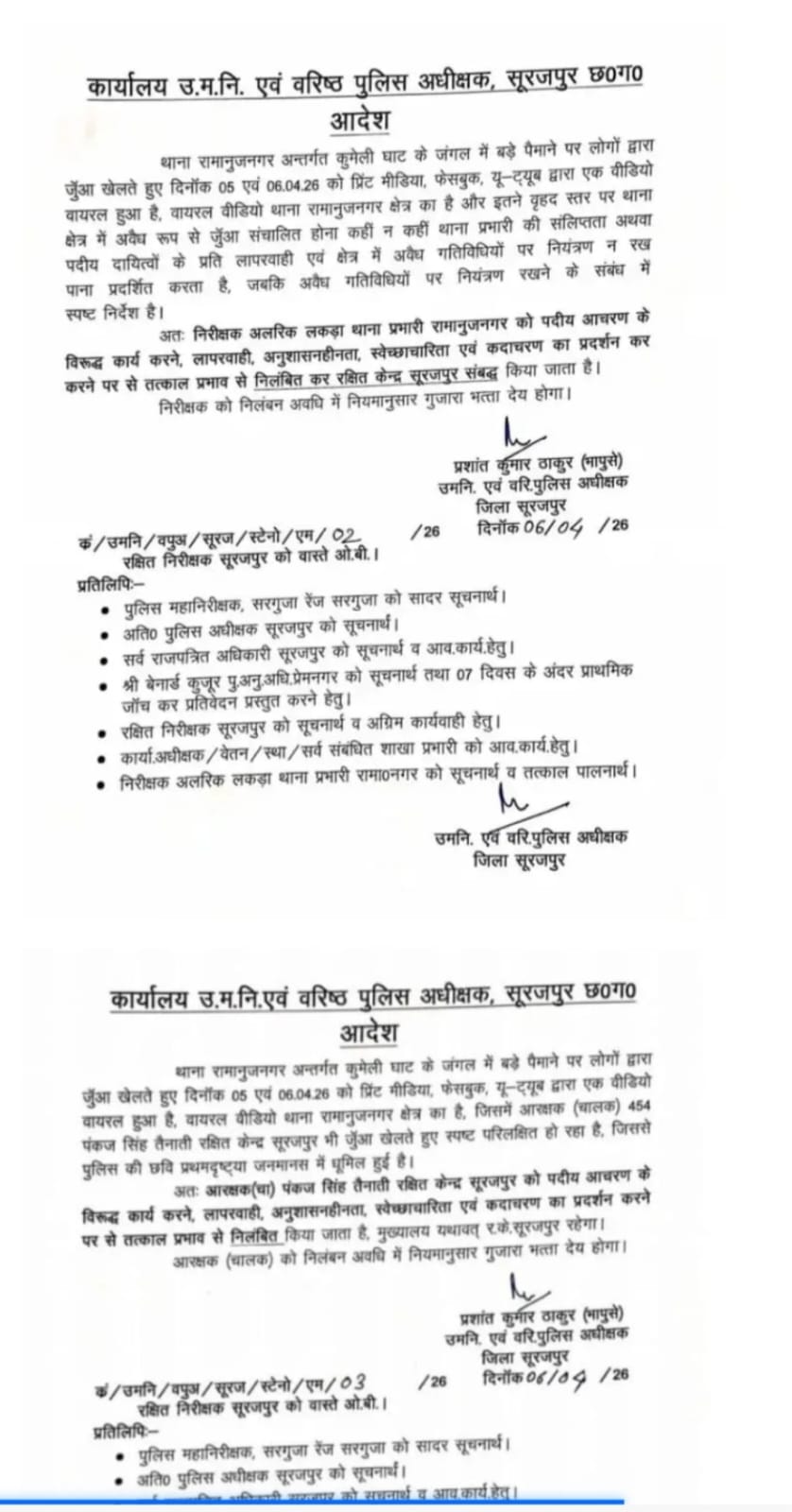 वहीं, आरक्षक पंकज सिंह को भी पुलिस की छवि धूमिल करने और जुए में संलिप्तता के आरोप में तत्काल प्रभाव से निलंबित कर दिया गया है। इस मामले की जांच की जिम्मेदारी रक्षित निरीक्षक अशोक गिरी को सौंपी गई है।
