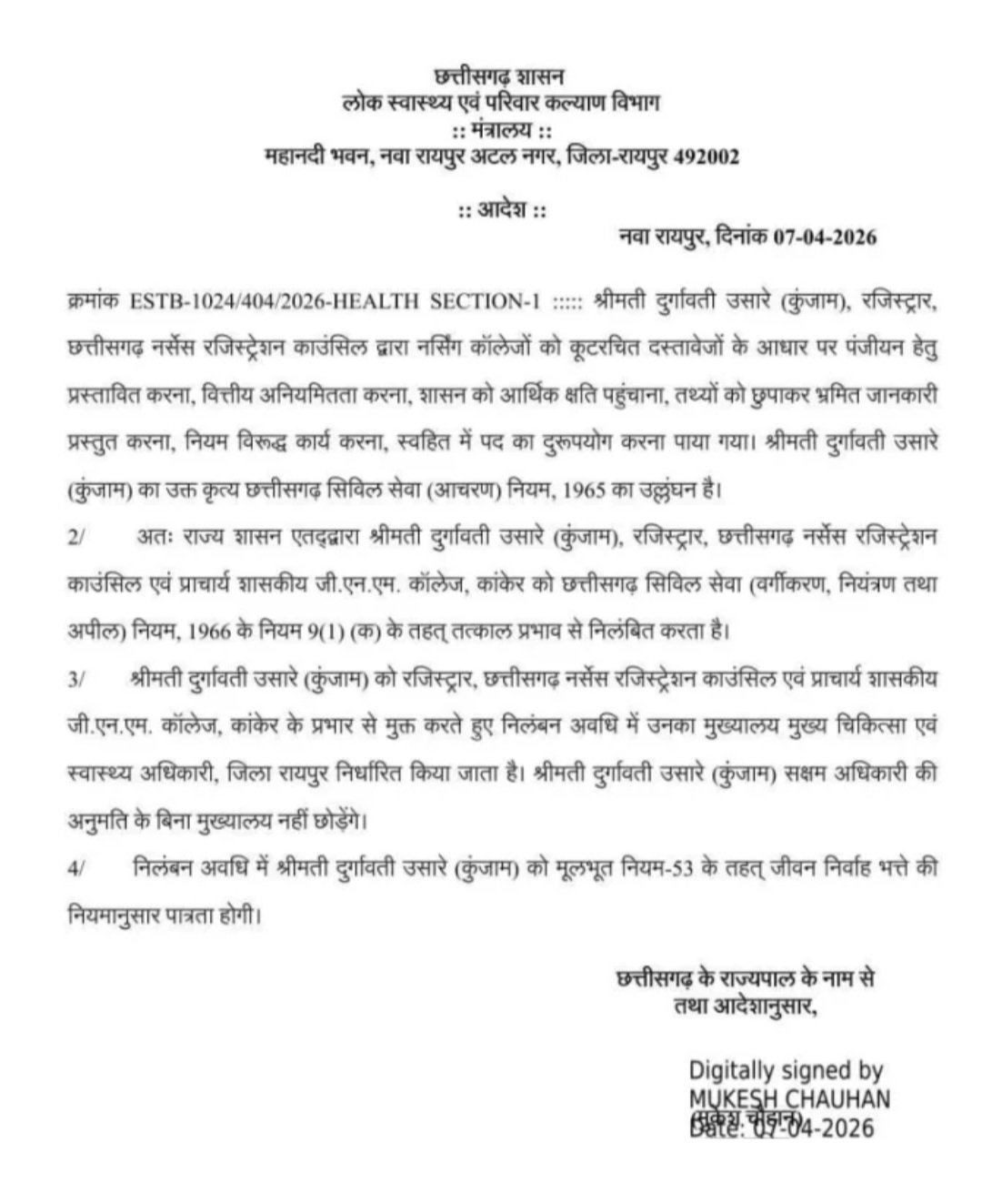 रायपुर। छत्तीसगढ़ के स्वास्थ्य विभाग में बड़ा प्रशासनिक एक्शन लेते हुए नर्सिंग काउंसिल की रजिस्ट्रार दुर्गावती कुंजाम को तत्काल प्रभाव से निलंबित कर दिया गया है। यह कार्रवाई प्राइवेट नर्सिंग कॉलेजों को फर्जी दस्तावेजों के आधार पर मान्यता देने, वित्तीय अनियमितताओं और पद के दुरुपयोग जैसे गंभीर आरोपों के बाद की गई है।
