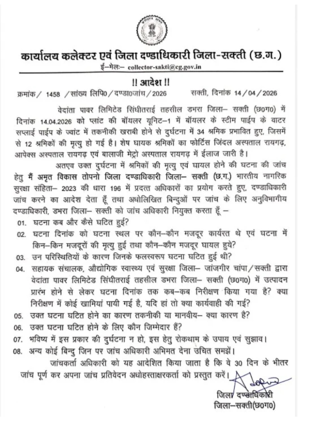 सक्ती। वेदांता पावर प्लांट में 14 अप्रैल को हुए बॉयलर ब्लास्ट में मरने वाले श्रमिकों की संख्या 23 पहुंच गई है, वहीं 12 घायल श्रमिकों का अलग-अलग अस्पतालों में इलाज जारी है। बीते 12 घंटे के दौरान मृत श्रमिकों का आंकड़ा 20 से 23 पहुंच गया है. मरने वाले तीन श्रमिकों में से रायगढ़ मेडिकल कॉलेज में भर्ती पश्चिम बंगाल निवासी सुब्रतो जेना और कालडा हॉस्पिटल, रायपुर में भर्ती उत्तर प्रदेश निवासी किस्मत अली सहित एक अन्य श्रमिक शामिल है। इस तरह से इस भीषण हादसे में जान गंवाने वाले श्रमिकों में पांच श्रमिक छत्तीसगढ़ और शेष 18 श्रमिक अन्य प्रांतों से हैं।