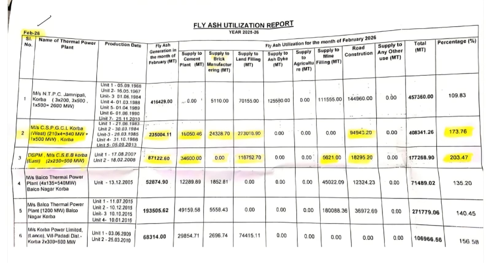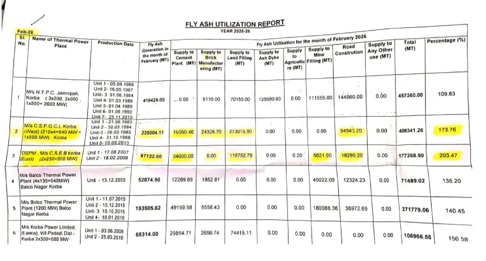 सबसे बड़ा सवाल यह है कि जब रिकॉर्ड में राख का निष्पादन 200 प्रतिशत से अधिक दिखाया जा रहा है, तो फिर बांधों में जगह की कमी और लगातार बढ़ता दबाव क्यों दिखाई दे रहा है। आंकड़ों और जमीनी हकीकत के बीच यह अंतर अब बहस का मुख्य मुद्दा बन गया है। रिपोर्ट्स के अनुसार, DSPM (CSEB कोरबा पूर्व) ने 87,122.60 MT राख उत्पादन के मुकाबले 203.47% उपयोगिता दर दर्ज करने का दावा किया है, जबकिछत्तीसगढ़ राज्य विद्युत उत्पादन कंपनी लिमिटेड के HTPP कोरबा (पश्चिम) यूनिट ने 173.76% उपयोगिता दर बताई है।