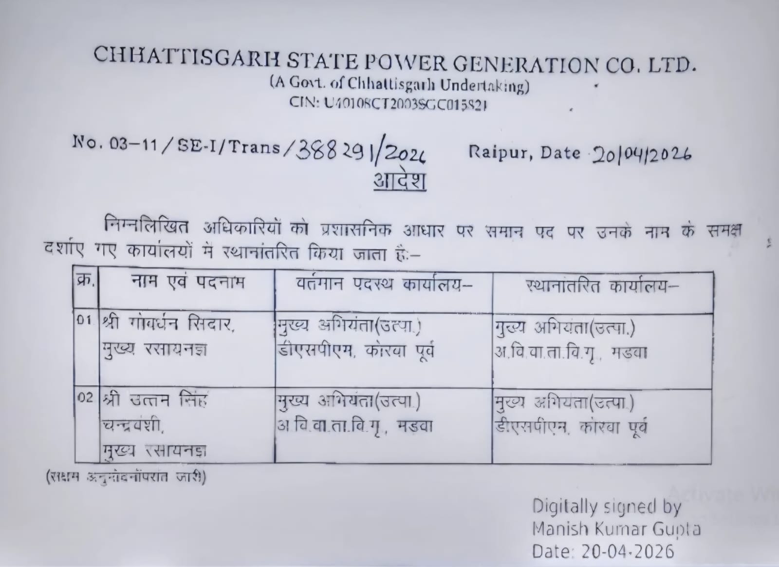 कोरबा। सरकारी आरामगाह (रेस्ट हाउस) को ‘मैखाना’ बनाने वाले अधिकारियों पर आखिरकार गाज गिर गई है। डीएसपीएम (DSPM) प्लांट के रेस्ट हाउस में शनिवार को सजी शराब की महफिल का अंजाम तबादले के रूप में सामने आया है। छत्तीसगढ़ राज्य विद्युत उत्पादन कंपनी लिमिटेड (CSPGCL) ने सोमवार को आदेश जारी करते हुए चीफ केमिस्ट को कोरबा पूर्व से हटाकर पावर प्लांट मड़वा भेज दिया है।