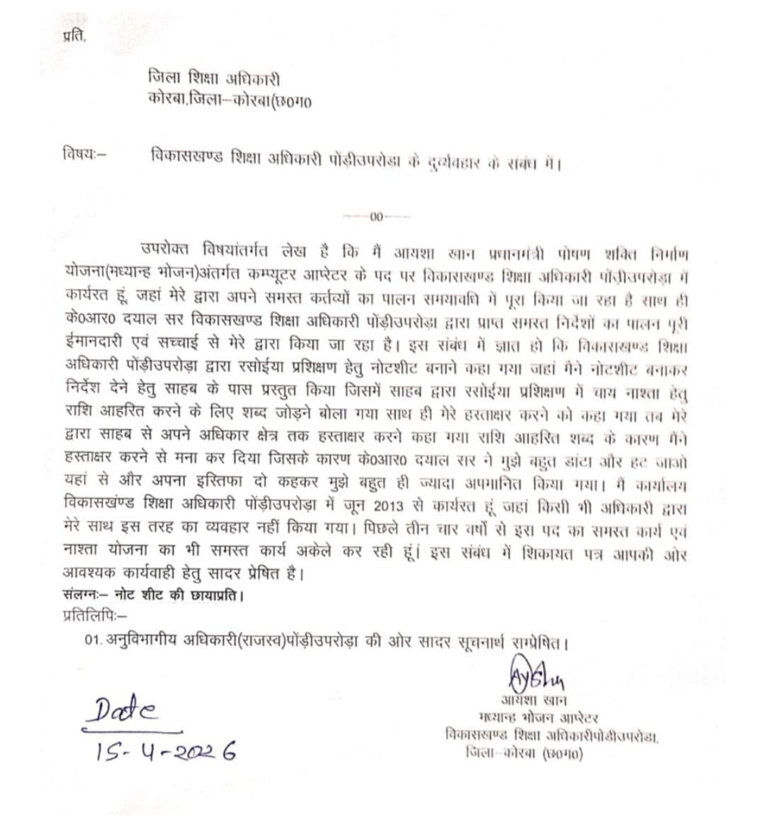 इस संबंध में ज्ञात हो कि विकासखण्ड शिक्षा अधिकारी पोंड़ीउपरोड़ा द्वारा रसोईया प्रशिक्षण हेतु नोटशीट बनाने कहा गया जहां नोटशीट बनाकर निर्देश देने हेतु उनके पास प्रस्तुत किया जिसमें उनके द्वारा रसोईया प्रशिक्षण में चाय-नाश्ता हेतु राशि आहरित करने के लिए शब्द जोड़ने बोला गया,साथ ही हस्ताक्षर करने को कहा गया तब प्रार्थी द्वारा साहब से अपने अधिकार क्षेत्र तक हस्ताक्षर करने कहा गया, राशि आहरित शब्द के कारण हस्ताक्षर करने से मना कर दिया जिसके कारण केआर दयाल ने बहुत डांटा और हट जाओ यहां से और अपना इस्तिफा दो कहकर बहुत ही ज्यादा अपमानित किया गया। कार्यालय विकासखण्ड शिक्षा अधिकारी पोंडीउपरोड़ा में जून 2013 से कार्यस्त है जहां किसी भी अधिकारी द्वारा उसके साथ इस तरह का व्यवहार नहीं किया गया। पिछले तीन-चार वर्षों से इस पद का समस्त कार्य एवं नाश्ता योजना का भी समस्त कार्य अकेले कर रही है। इस संबंध में शिकायत पत्र आवश्यक कार्यवाही हेतु प्रेषित किया गया है। इस मामले में बीईओ श्री दयाल का पक्ष जानने के लिए उनसे संपर्क किया गया किंतु उनका फोन रिसीव नहीं हुआ।