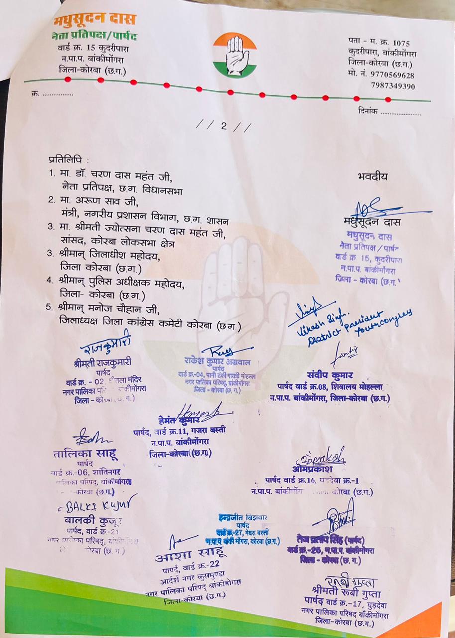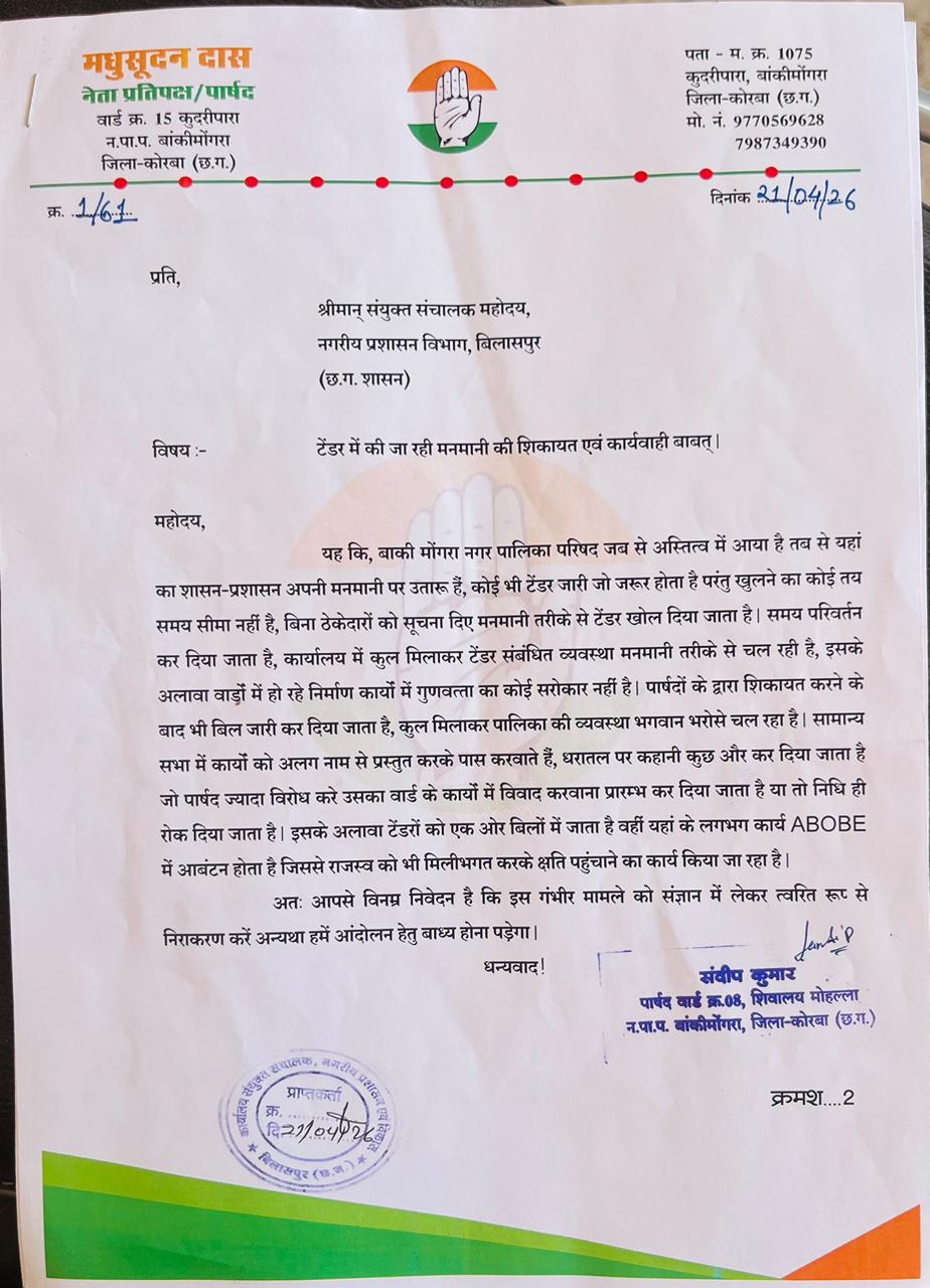 कोरबा-बांकीमोंगरा। नगर पालिका परिषद बाँकी मोंगरा में टेंडर प्रक्रिया में लगातार की जा रही मनमानी को लेकर विपक्षी पार्षदों ने संयुक्त रूप से संयुक्त संचालक,बिलासपुर को पत्र लिखकर कार्यवाही की माँग की है अन्यथा आंदोलन की चेतावनी दी है ..!