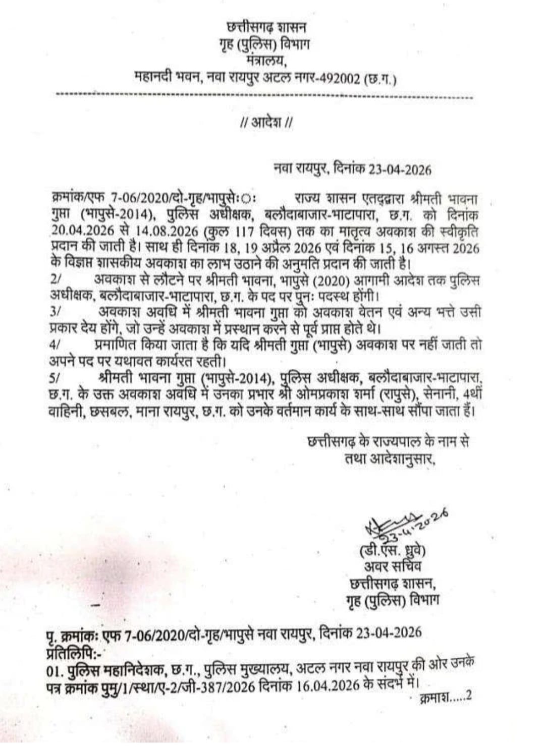 गृह विभाग द्वारा उनका 117 दिनों का अवकाश (14 अगस्त तक) स्वीकृत किया गया है। इस दौरान उनकी गैरमौजूदगी में OP Sharma को बलौदाबाजार एसपी का अतिरिक्त प्रभार सौंपा गया है।