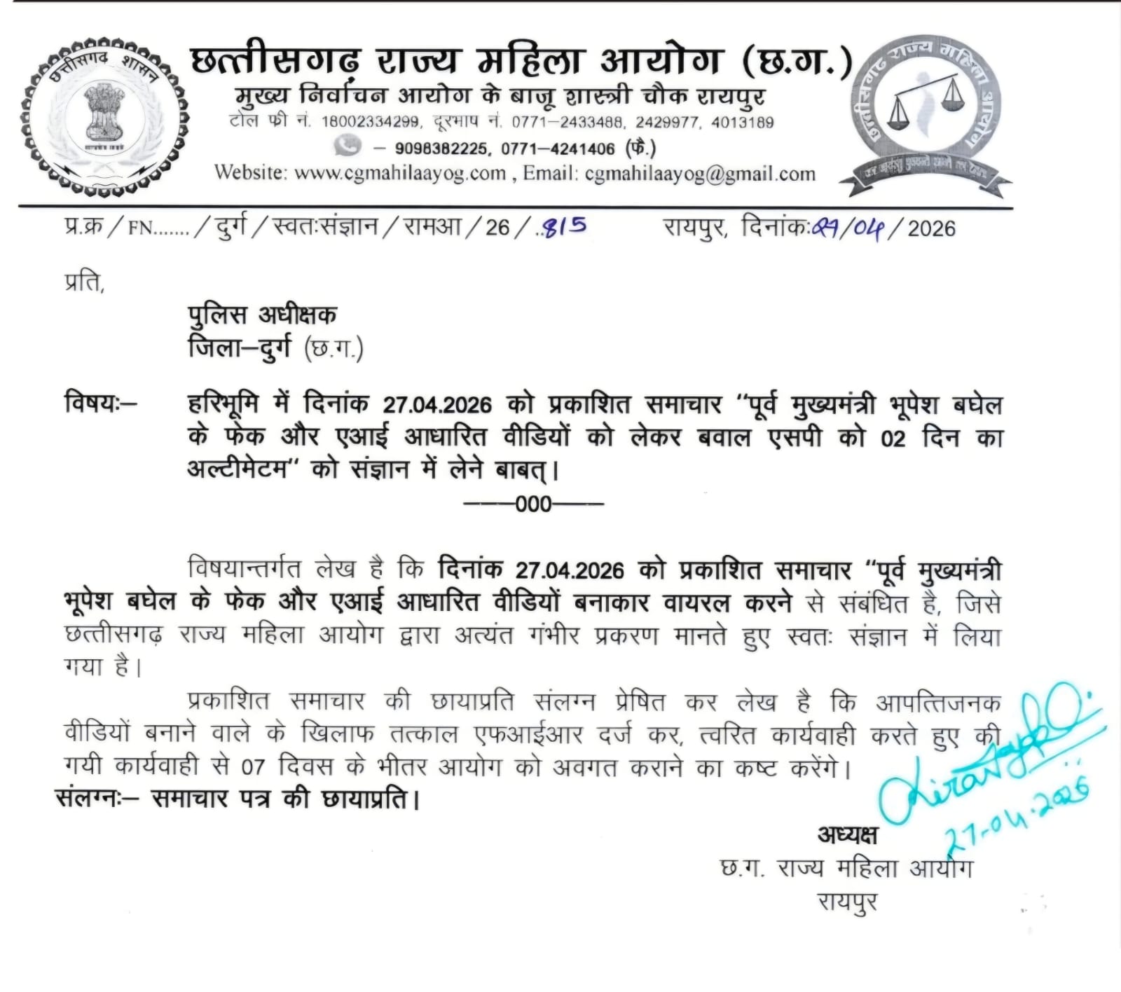 दिनांक 27.04.2026 को एक समाचार पत्र में प्रकाशित खबर, जिसका शीर्षक “पूर्व मुख्यमंत्री भूपेश बघेल के फेक और एआई आधारित वीडियो को लेकर बवाल, एसपी को 02 दिन का अल्टीमेटम” है, के आधार पर आयोग ने यह कार्यवाही शुरू की है। आयोग के अनुसार, आधुनिक तकनीक (AI) का दुरुपयोग कर पूर्व मुख्यमंत्री और एक महिला से संबंधित भ्रामक व आपत्तिजनक वीडियो वायरल किया जा रहा है, जिससे समाज में गलत संदेश जा रहा है।