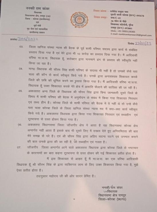 ननकीराम ने प्रधानमंत्री को लिखे अपने चिट्ठी में कहा है कि जांजगीर जिले के विधायक के कोरबा जिले के विरोध में की गई शिकायत से आहत हूं । इस तरह की अन्य जिले के विधायक द्वारा अन्य जिले की शिकायत करने की मंशा समझ से परे है। इससे हमारे जिले का तथा मुझ जैसे आदिवासी नेता एवं भाजपा पार्टी का भी आम जनता में विश्वास खराब हुआ है । उन्होंने अपने पत्र में विधायक सौरभ सिंह की बातों का खंडन करते हुए कहा है कि मैं कोरबा जिले के खनिज न्यास संस्थान की शासी परिषद की बैठक में शामिल हुआ था। मैंने अपने विधानसभा क्षेत्र रामपुर के लिए सड़क, पानी, स्वास्थ्य आदि कार्यों का प्रस्ताव दिए थे जो स्वीकृत भी हो रहे हैं।