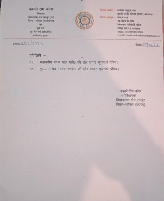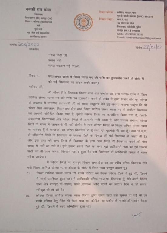 ननकीराम ने प्रधानमंत्री को लिखे अपने चिट्ठी में कहा है कि जांजगीर जिले के विधायक के कोरबा जिले के विरोध में की गई शिकायत से आहत हूं । इस तरह की अन्य जिले के विधायक द्वारा अन्य जिले की शिकायत करने की मंशा समझ से परे है। इससे हमारे जिले का तथा मुझ जैसे आदिवासी नेता एवं भाजपा पार्टी का भी आम जनता में विश्वास खराब हुआ है । उन्होंने अपने पत्र में विधायक सौरभ सिंह की बातों का खंडन करते हुए कहा है कि मैं कोरबा जिले के खनिज न्यास संस्थान की शासी परिषद की बैठक में शामिल हुआ था। मैंने अपने विधानसभा क्षेत्र रामपुर के लिए सड़क, पानी, स्वास्थ्य आदि कार्यों का प्रस्ताव दिए थे जो स्वीकृत भी हो रहे हैं।