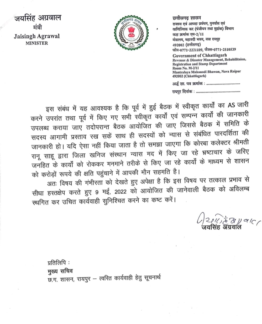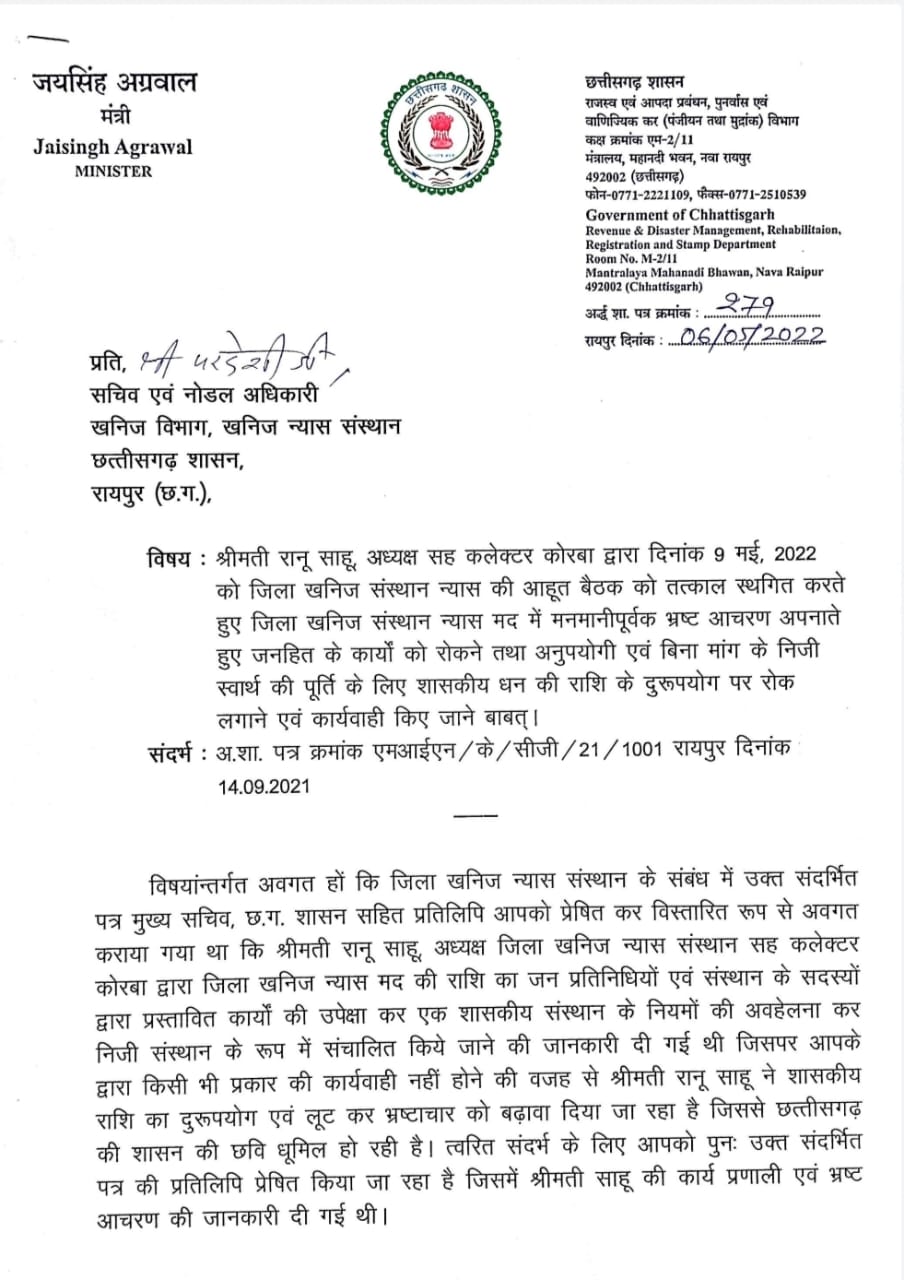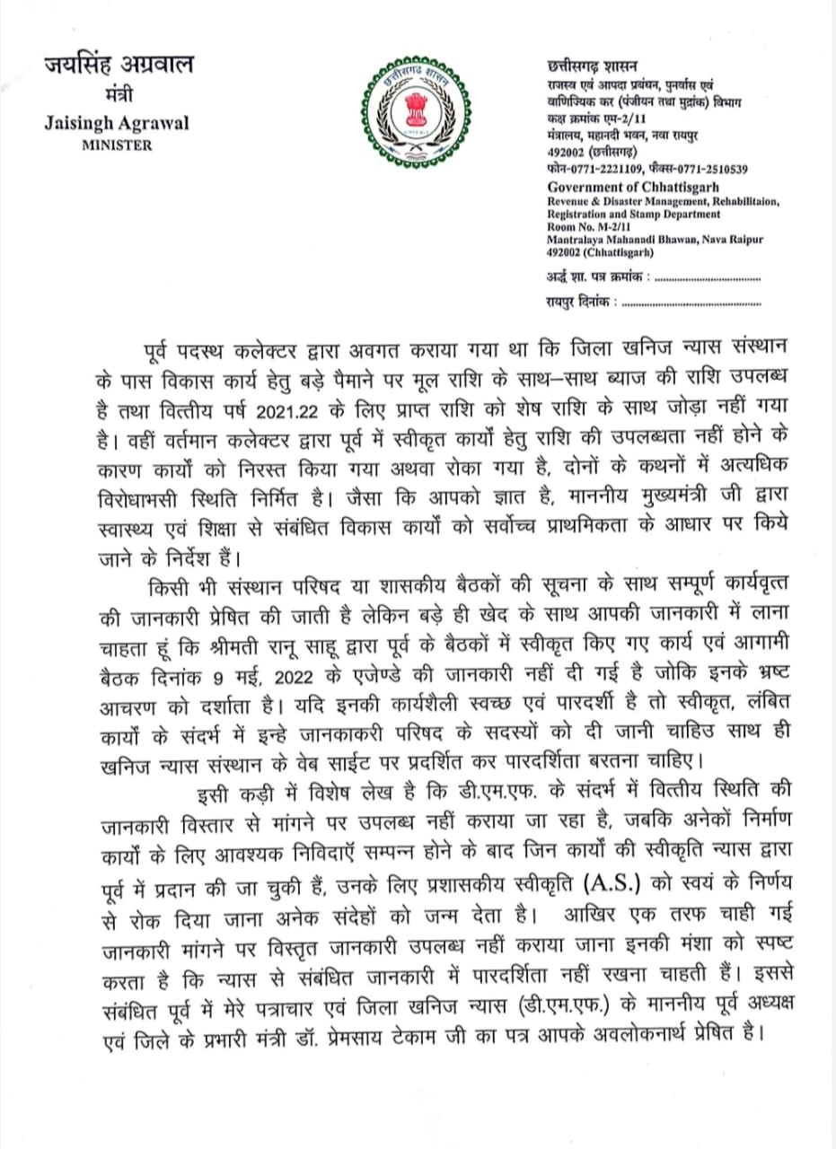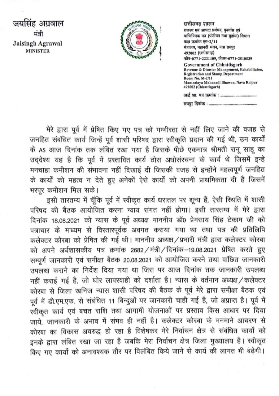 खनिज सचिव को लिखे पत्र में राजस्व मंत्री श्री अग्रवाल ने कोरबा में कलेक्टर रानू साहू के पदस्थापना के समय से खनिज न्यास मद में व्याप्त भ्रष्टाचार और जनहित के कार्यों पर रोक लगाते हुए मनमाना कार्यशैली को अपनाते हुए शासन को करोड़ों रूपये की क्षति पहुंचाते हुए न्यास को एक शासकीय संस्थान के रूप में न संचालित करते हुए एक निजी कम्पनी के तौर पर संचालन करते हुए सरकार की छवि धूमिल करने की बात कही है। राजस्व मंत्री ने पत्र में इस तथ्य पर विशेष ध्यान आकृष्ट कराया है कि जिला खनिज न्यास के शासी परिषद द्वारा पूर्व में स्वीकृत कार्यों के लिए प्रशासकीय स्वीकृति न प्रदान कर जनहित के कार्यों को रोके रखा गया। इसी प्रकार से 9 मई को आयोजित की जाने वाली बैठक के लिए सदस्यों को समय पर सूचना नहीं देना, पूर्व बैठक का कार्यवृत्त उपलब्ध नहीं कराना और बैठक का कोई एजेण्डा नहीं देना यह साबित करता है कि यह न्यास एक निजी कम्पनी के तौर पर संचालित हो रहा है न कि यह एक शासकीय संस्थान है। इस विषय पर राजस्व मंत्री का कहना है कि यदि उपर्युक्त जानकारियां सदस्यों को उपलब्ध नहीं कराई जाएंगी तो सदस्य किस आधार पर नए प्रस्ताव तैयार कर बैठक में चर्चा के लिए प्रस्तुत करेंगे। इस संबंध मेें नोडल अधिकारी को 14 सितम्बर, 2021 को लिखे गए पत्र का हवाला भी राजस्व मंत्री ने दिया है जिस पर फिलहाल कोई कार्रवाई नहीं की जा सकी है।