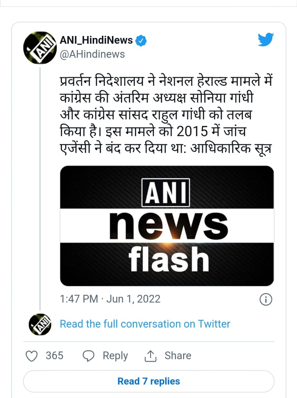 दिल्ली । न्यूज़ एजेंसी ANI ने ट्विटर के माध्यम से बताया है कि आधिकारिक सूत्रों के हवाले से मिली जानकारी के अनुसार प्रवर्तन निदेशालय यानी ईडी ने कांग्रेस प्रमुख सोनिया गांधी और बेटे राहुल गांधी को नेशनल हेराल्ड मामले में 8 जून को तलब किया है। इसके अलावा राहुल गांधी को 2 जून को बुलाया गया है, लेकिन उन्होंने पेश होने के लिए वक्त दिए जाने की मांग की गई है।