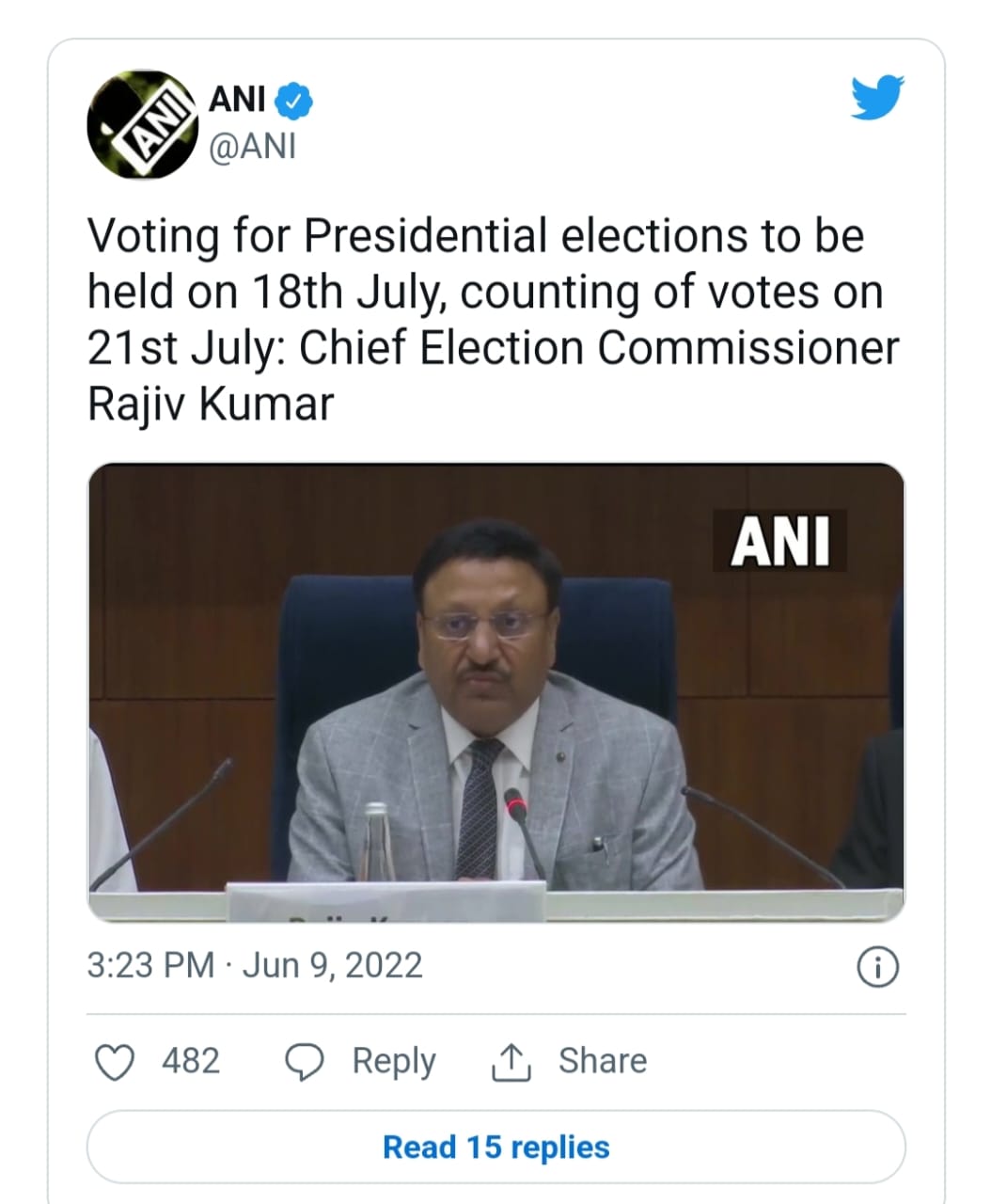 नई दिल्ली । चुनाव आयोग ने राष्ट्रपति चुनाव के तारीख का ऐलान कर दिया है। राष्ट्रपति पद के लिए चुनाव 18 जुलाई को होंगे और 21 जुलाई को नए राष्ट्रपति मिल जाएंगे। मुख्य चुनाव आयुक्त राजीव कुमार ने आज दिल्ली में राष्ट्रपति चुनाव के लिए विस्तृत कार्यक्रम की घोषणा की। राष्ट्रपति चुनाव के लिए 29 जून तक नामांकन किया जा सकता है।