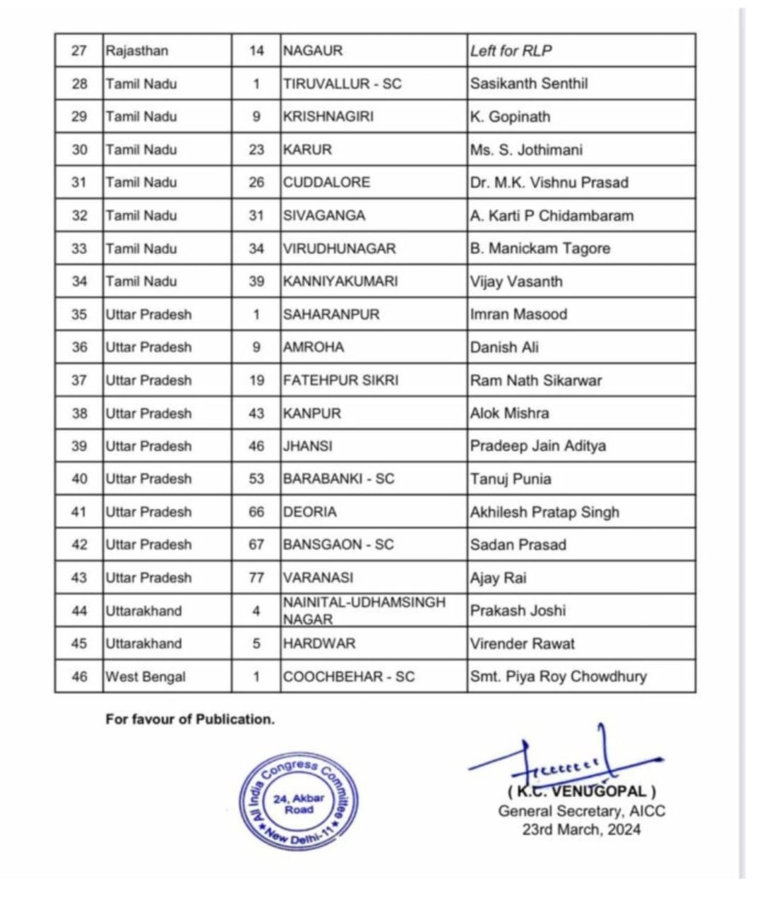 रायपुर -दिल्ली।कांग्रेस ने लोकसभा चुनाव 2024 के लिए प्रत्याशियों की चौथी लिस्ट जारी कर दी है। छत्तीसगढ़ के एक सहित 46 सीटों के लिए प्रत्याशियों की सूची जारी की गई है।छत्तीसगढ़ के बस्तर से पूर्व मंत्री वर्तमान विधायक कवासी लखमा को प्रत्याशी बनाया गया है। इस सीट पर वर्तमान में कांग्रेस के प्रदेश अध्यक्ष दीपक बैज सांसद हैं।