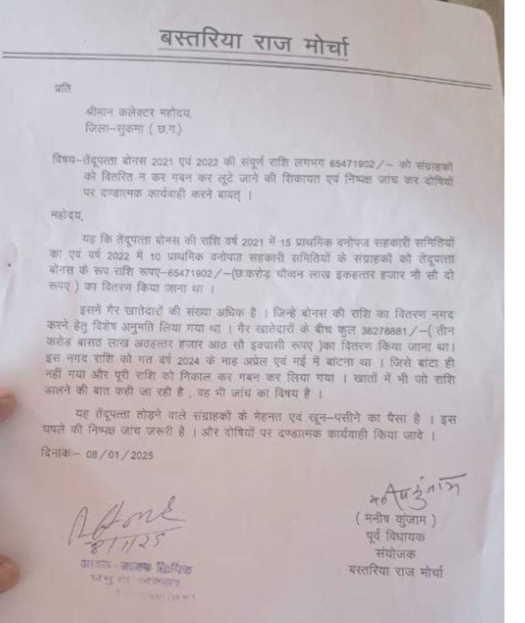 इस मामले में पूर्व विधायक मनीष कुंजाम का एक पत्र सोशल मीडिया में वायरल हो रहा ,जिसमें पूर्व विधायक और बस्तरिया राज मोर्चा के संयोजक मनीष कुंजाम की तरफ से 8 जनवरी 2025 को कलेक्टर को लिखे पत्र में वर्ष 2021और वर्ष 2022 में सुकमा के तेंदूपत्ता सहकारी समितियों से जुड़े संग्राहकों का साढ़े 6 करोड़ रुपए से भी अधिक की राशि गबन किए जाने का उल्लेख है। फिलहाल यह स्पष्ट नहीं हो सका है कि इस प्रकरण में EOW ने मनीष कुंजाम को भी आरोपी बनाया है या फिर उनसे पूछताछ करने गए थे।